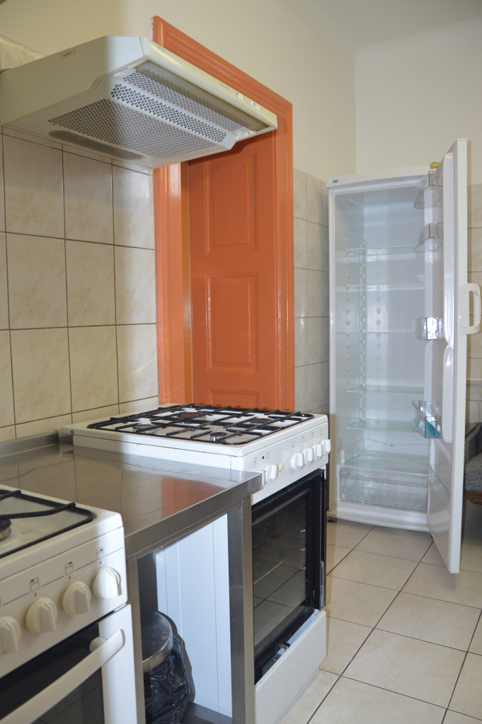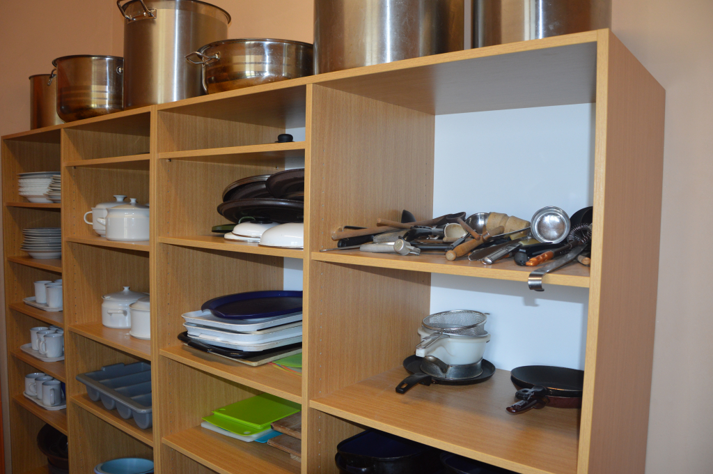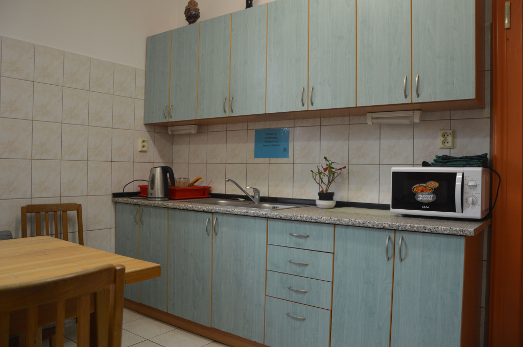 Lednička, 2 plynové sporáky s elektrickou troubou, mikrovlnná trouba, běžné vybavení kuchyňským nádobím, studená + teplá voda, vedle kuchyně koupelna se sprchovým koutem + WC pro vedoucí, za kuchyní spížka s lednicí a mrazákem, plynový sporák.